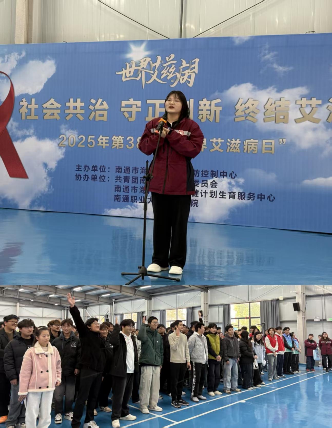随后,海门区疾控中心急传性艾科科员环冬香为同学们带来了一场生动有趣的防艾知识宣讲。她结合真实案例,用通俗的语言讲解了艾滋病的传播途径、预防方法和检测知识,并通过有奖问答与同学们积极互动,现场气氛热烈。