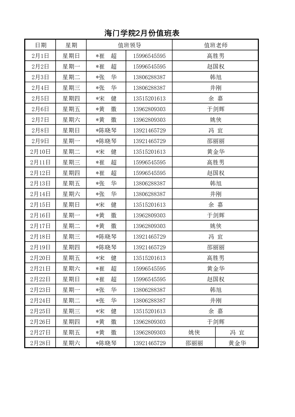 海门学院2月份值班表