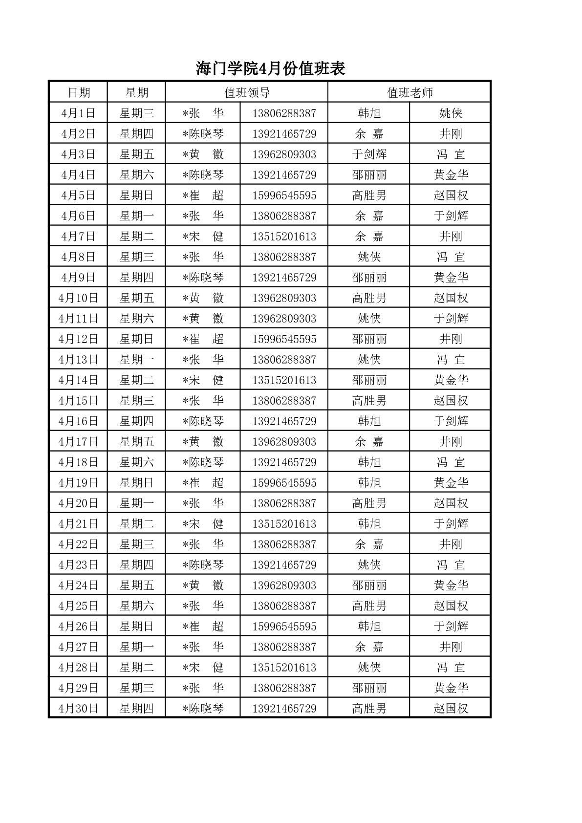 海门学院4月份值班表