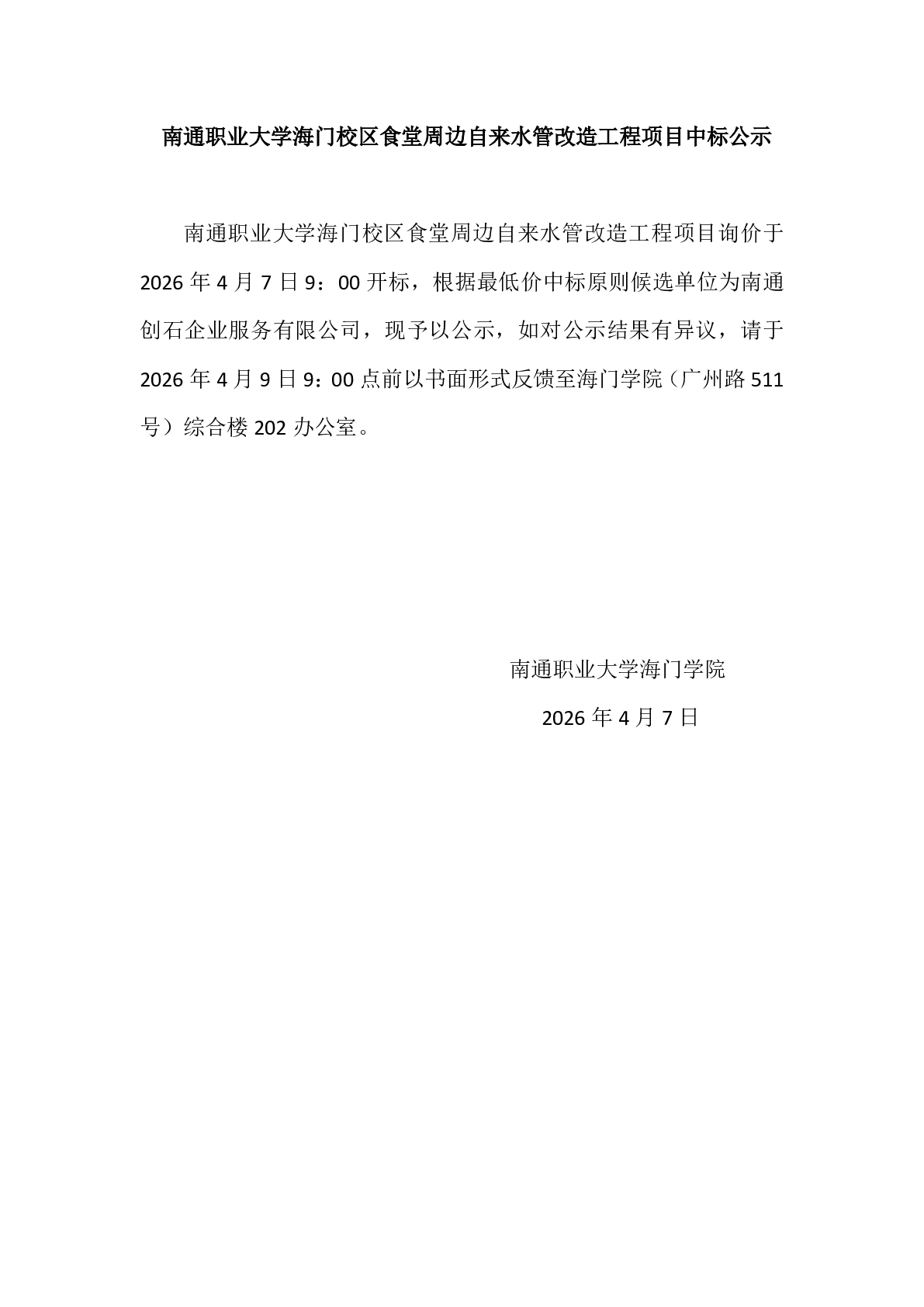 南通职业大学海门校区食堂周边自来水管改造工程项目中标公示