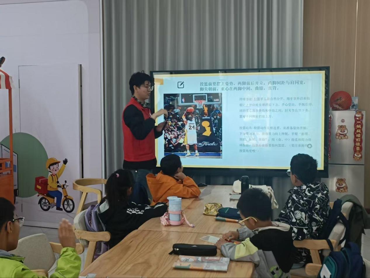 志愿者杜嘉豪同学结合自身特长与小朋友们的兴趣爱好,专门开设了“篮球体育小课堂”。他向孩子们详细讲解了投篮的持球姿势、发力方式和瞄准点等技巧。杜嘉豪生动的示范和耐心的指导,瞬间点燃了小朋友们对篮球的热情。大家纷纷踊跃尝试,在运动中感受体育的魅力,现场气氛热烈。