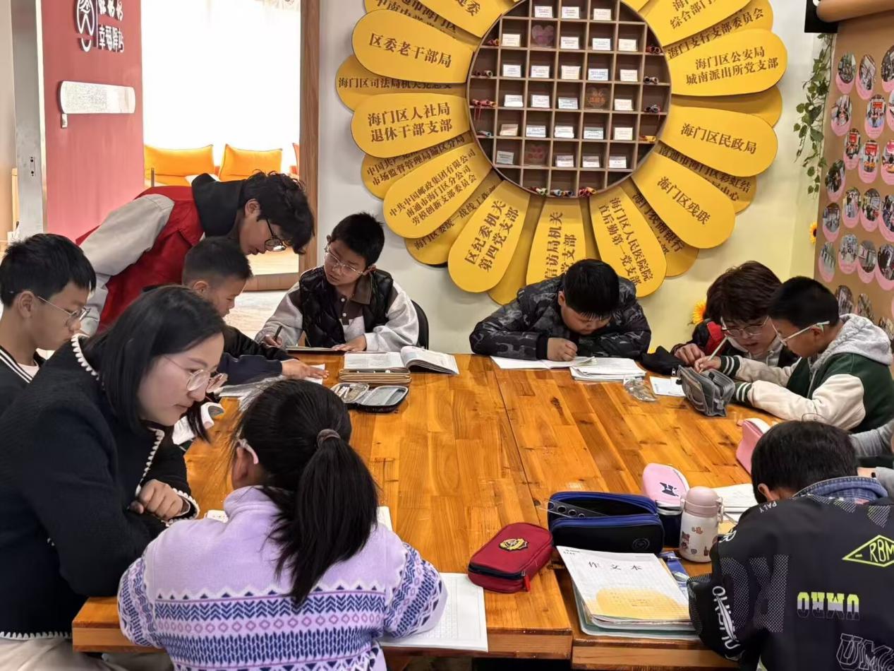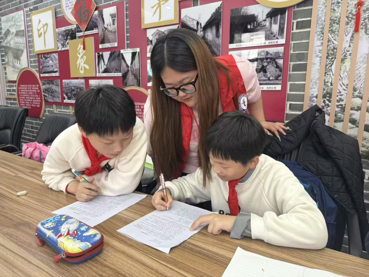 清晨,志愿者们抵达社区后,便投入到紧张有序的服务中。在作业辅导环节,志愿者们化身‘小老师’,耐心解答孩子们的学习疑问。面对低年级小朋友在遇到难题时的焦虑神情,志愿者温柔安抚,循循善诱,引导他们一步步攻克难题,在传授知识的同时也传递了温暖与鼓励。